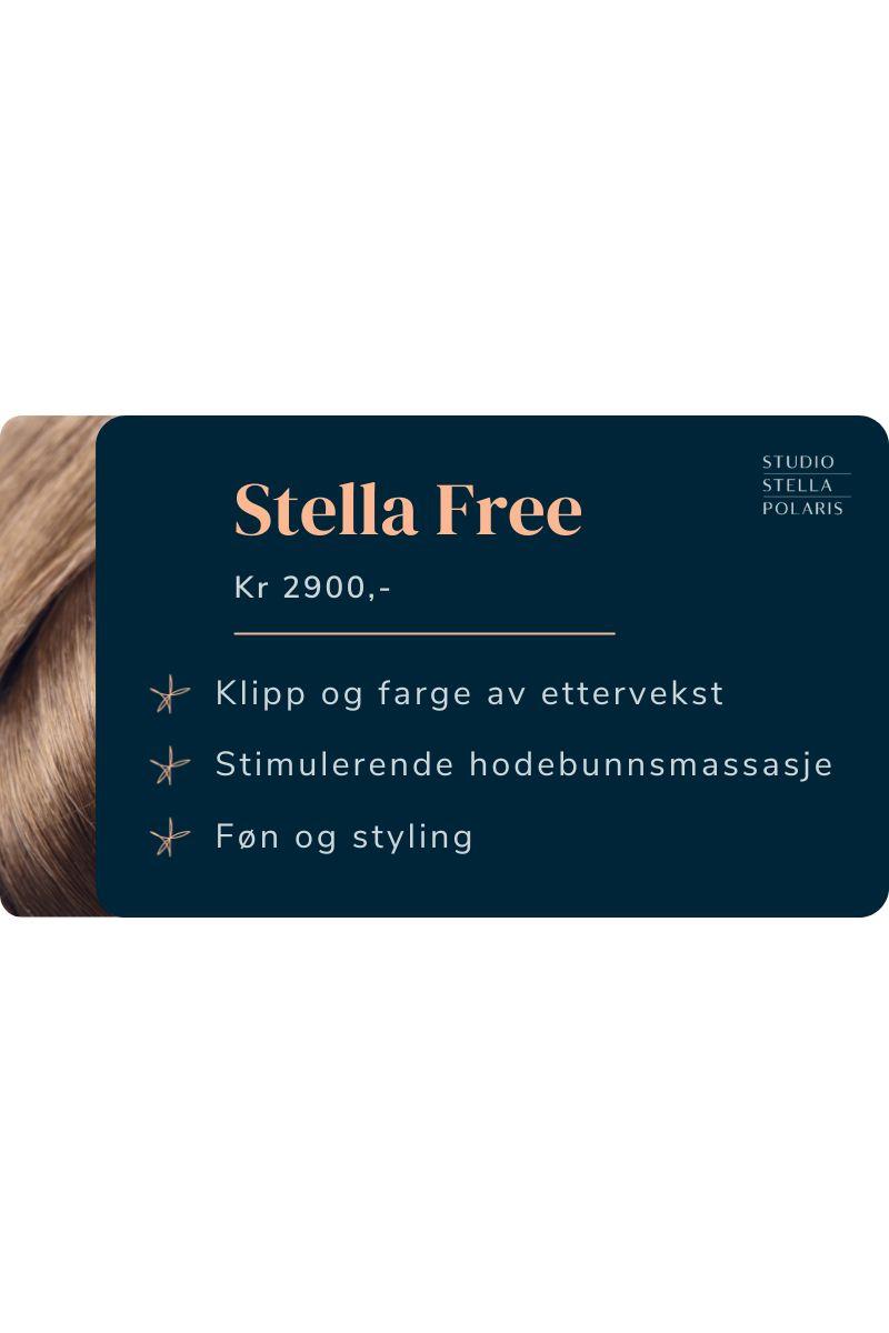 Fornyende sesongklipp og farging av etterveksten inkludert en stimulerende vitamin/mineral hodebunnsmassasje, føn og styling. Studio Stella Polaris tilbyr deg stjernebehandling med servering, personlig veiledning og egen fast, frisør. Vi er helt i front med nye, naturlige og miljøvennlige produkter av høy kvalitet. Stella Free utføres med egne produkter fra Oolaboo; et nytt, utsøkt luksusmerke i Norge. Velkommen til godfølelsen. Shine Like a Star!