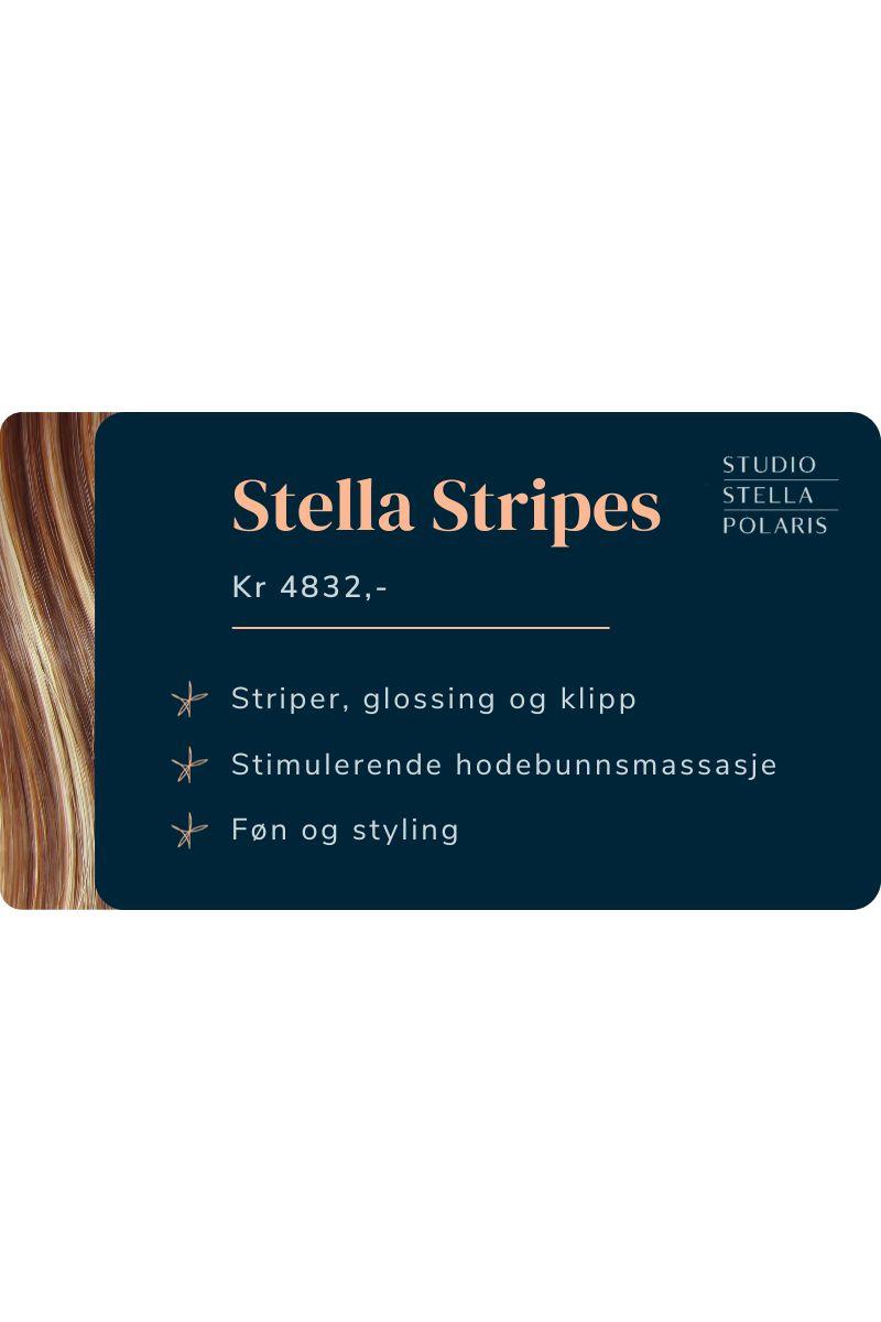 Fornyende sesongklipp, striper av etterveksten og glossing inkludert en stimulerende vitamin/mineral hodebunnsmassasje, føn og styling. Studio Stella Polaris tilbyr deg stjernebehandling med servering, personlig veiledning og egen fast, frisør. Vi er helt i front med nye, naturlige og miljøvennlige produkter av høy kvalitet. Stella Stripes utføres med egne produkter fra Oolaboo; et nytt, utsøkt luksusmerke i Norge. Velkommen til godfølelsen. Shine Like a Star!